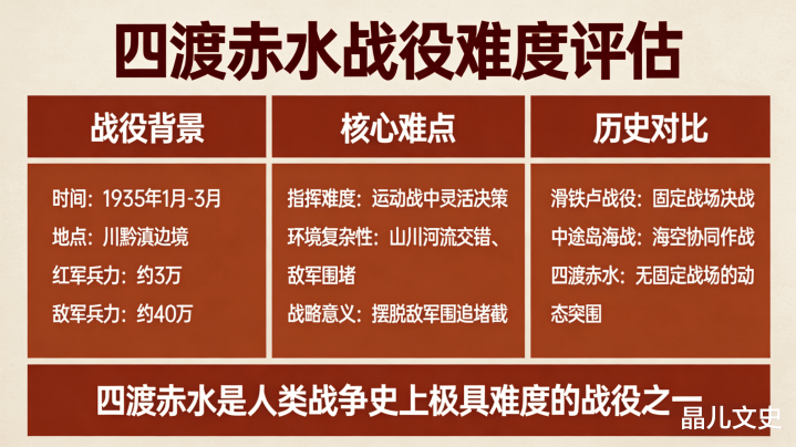 四渡赤水是东谈主类史上难度最高的斗殴吗?谜底很直白:算不上东谈主类史上难度最高的,但它的难,在以少胜多的判辨战里,总共是顶尖水平,何况是惟一份的难。为啥说不是最高?因为古今中外的斗殴,难的场地不相通。有的拼东谈主多,几十上百万军力硬刚;有的组装备,拿过期火器招架先进枪炮;还有的拼环境,在沙漠、极地干戈,光活下去就难。这些难各有各的样,没法比出个“最”来。
