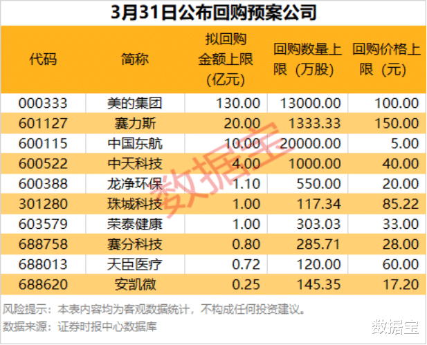 3月31日共有10家公司发布公告,拟进行股份回购,拟回购金额最高的是好意思的集团,拟回购资金总和65亿元—130亿元,回购股份将用于执行股权激勉想象及/或职工执股想象;其次是赛力斯,拟回购不低于10亿元且不卓著20亿元,回购股份拟用于减少公司注册本钱。
