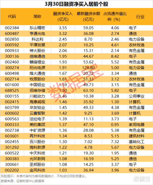 具体到个股,3月30日共有1872只股获融资净买入,净买入金额在千万元以上的有473只,其中26只融资净买入额超1亿元。东山精密融资净买入额居首,当日净买入3.55亿元;其次是亨通光电、科达利,融资净买入金额区别为3.32亿元、2.45亿元,融资净买入金额居前的还有平潭发展、神火股份、信维通讯等。