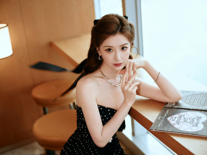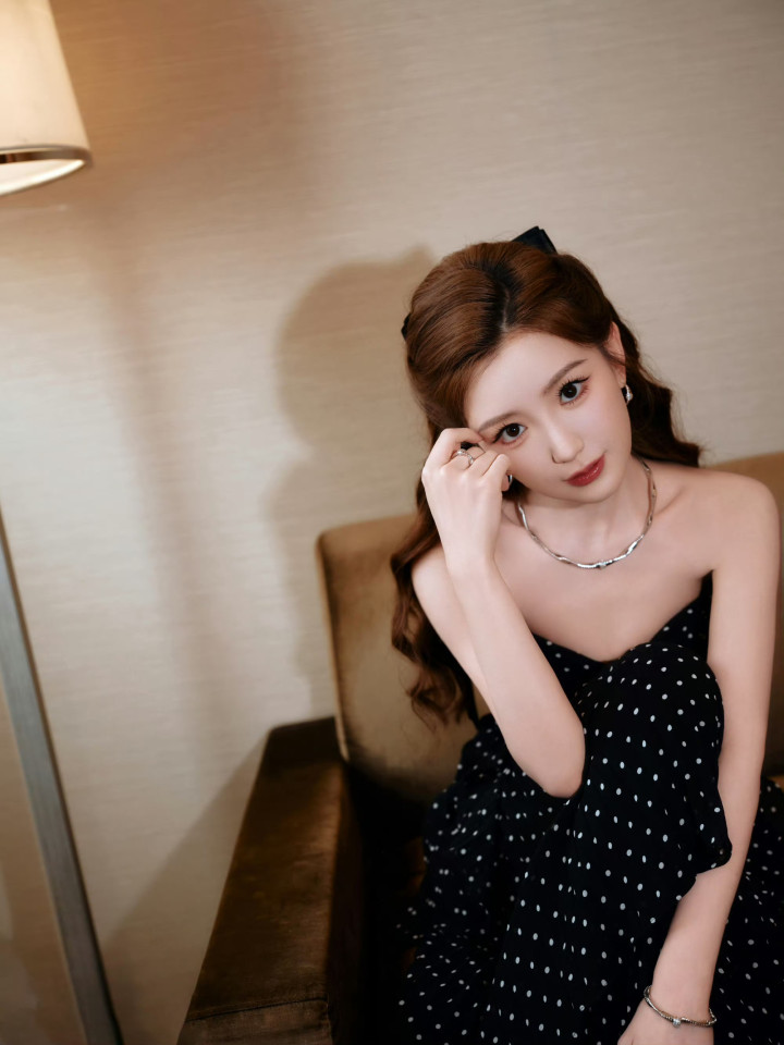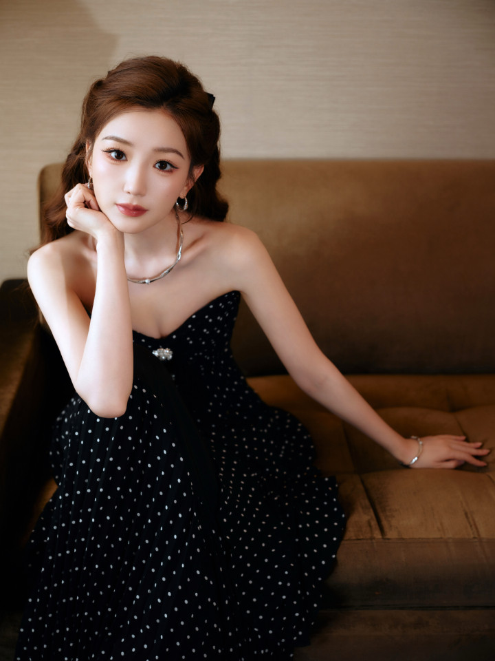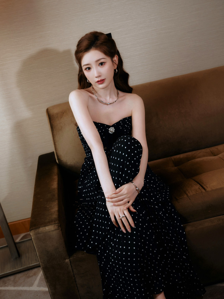 江南体育(JNsports)官网app下载 毛晓彤玄色波点抹胸连衣裙, 收尾版优雅迷东说念主的猫猫公主