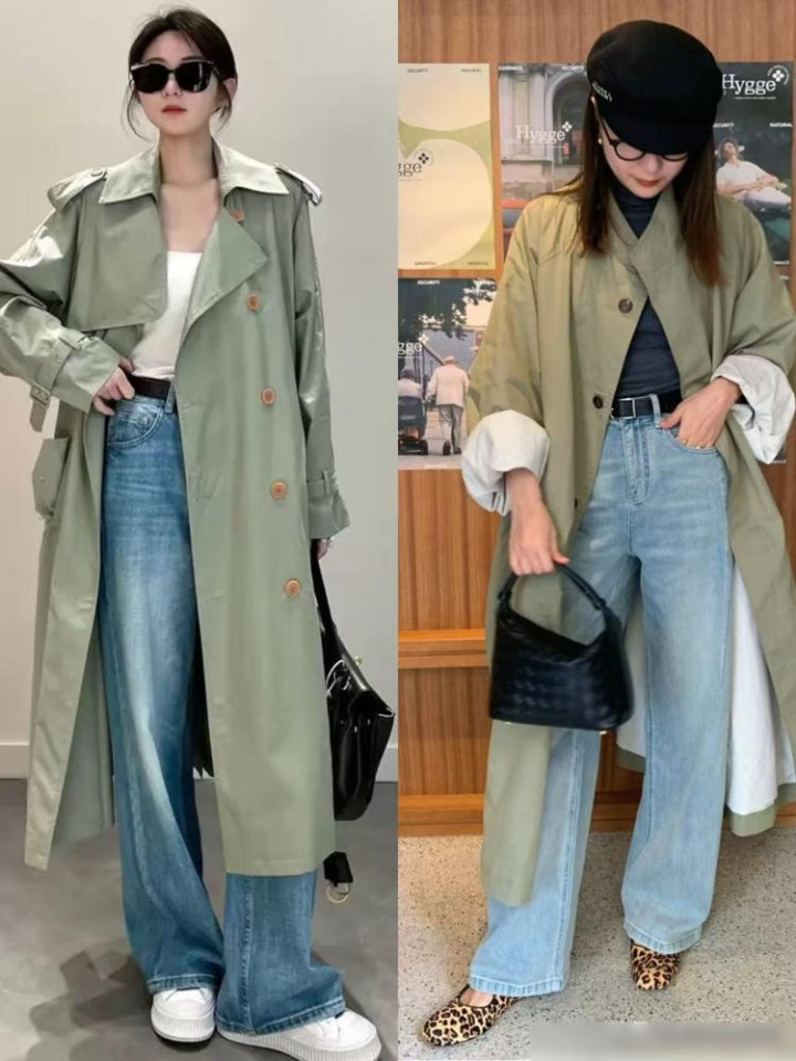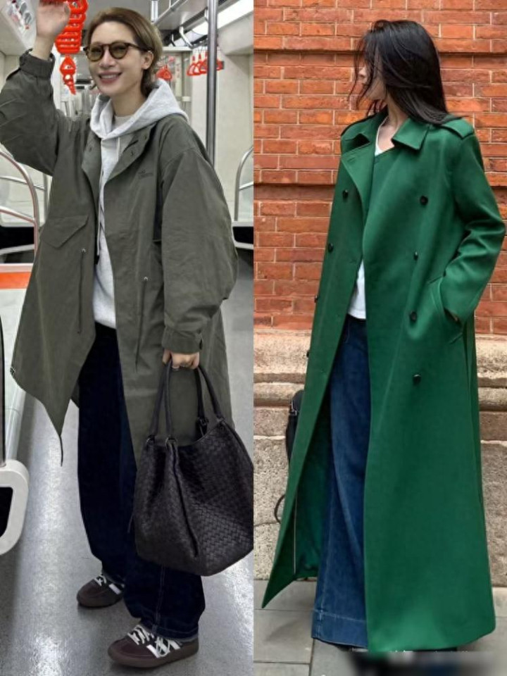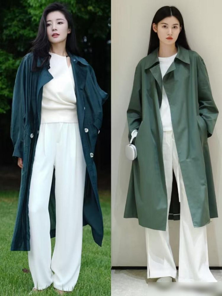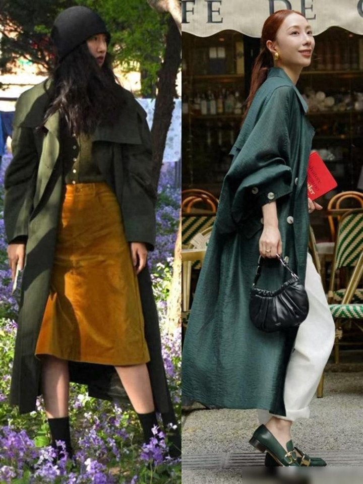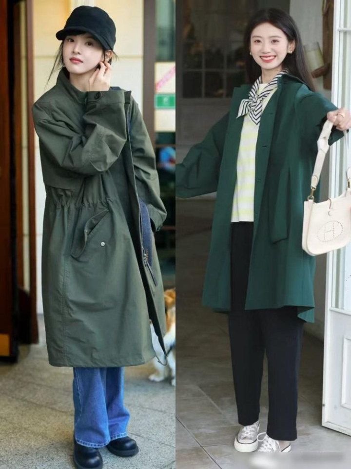 早春穿绿色心机齐好。草木绿不挑肤色,黄皮穿也显气色。一件质感好的风衣能穿好几年。