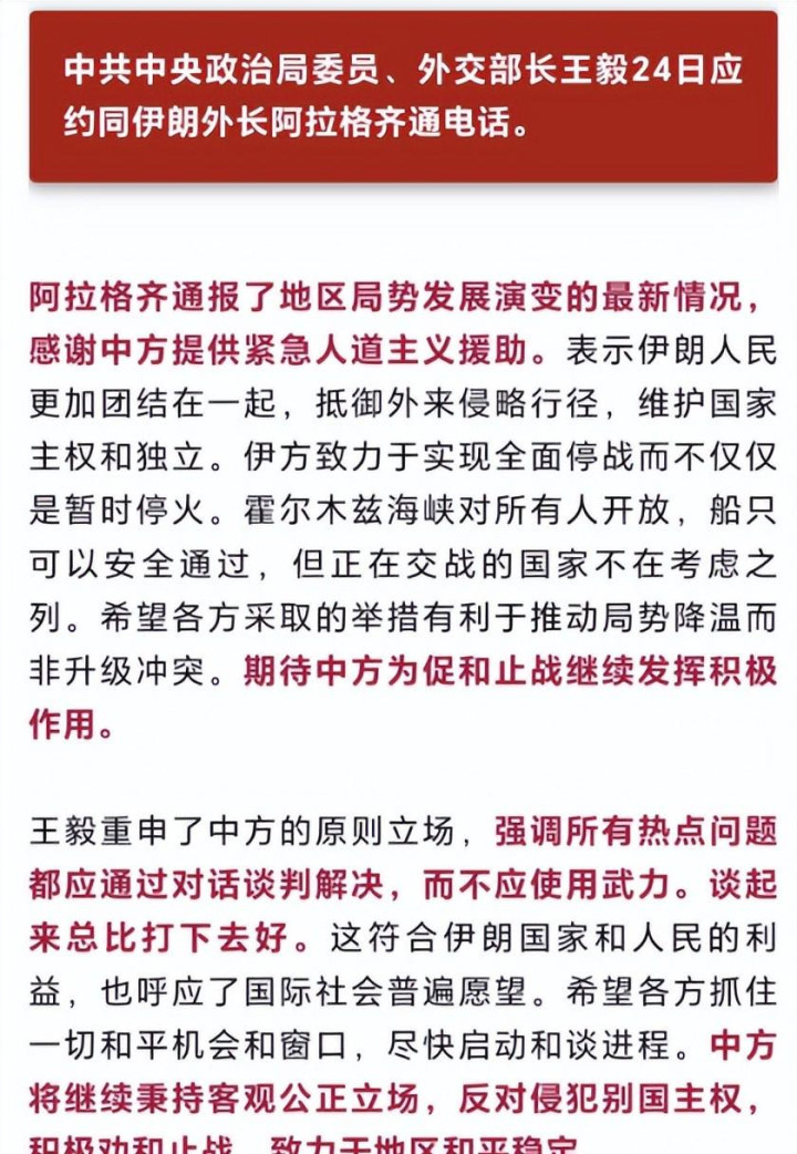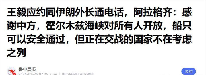 而就在不到24小时前,中国际长王毅刚与伊朗外长阿拉格皆通过电话,说合的恰是包括霍尔木兹海峡安全在内的弥谅解势。