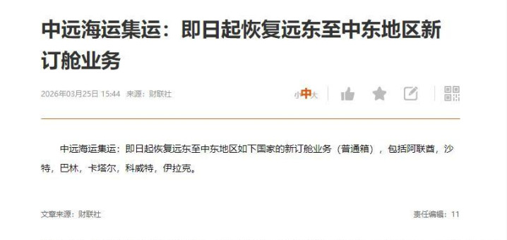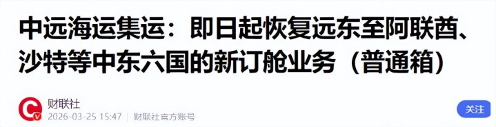 3月25日,股票商场刚刚收盘,中远海运集运发布见知,复原海湾六国新订舱业务。