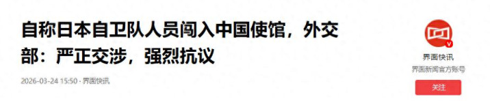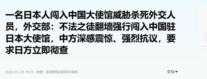 与此同期,据路透社3月24日报谈,日本政府拟在年度酬酢蓝皮书中,将中日干系从“最要紧的双边疆系之一”下调为“要紧邻国”,官方层面主动裁汰双边疆系优先级。淹没天,别称日本东谈主翻墙闯入中国驻日大使馆,佩戴刀具要挟伤害中海酬酢东谈主员,这一恶性事件进一步加重了垂危氛围。