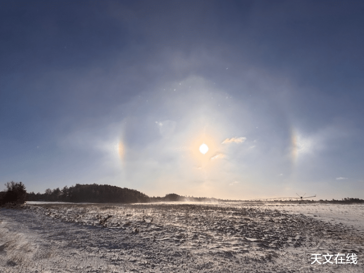 稽查地球天外社区相片。邦妮斯万在威斯康星州拍摄了这张相片,并写谈:朝晨向东行驶时,日出周围的光晕和幻日相称亮堂,当我找到一个能拍下完整画面的视角时,不得不靠边泊车握拍谢谢邦妮
