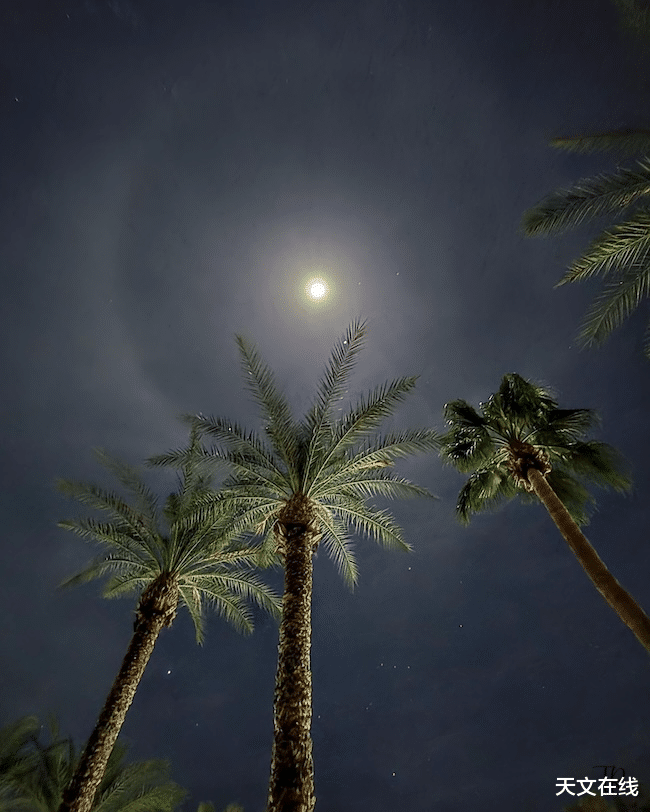 请稽查地球天外社区相片。亚利桑那州的特蕾莎雷恩斯拍摄了这张相片,并写谈:月晕,右下角可见猎户座,木星位于月球旁,从上方棕榈树叶片间笼统可见。感谢特蕾莎请防卫 —— 与可能出现彩色的日晕不同,月晕频频呈无色。